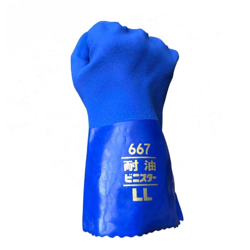 Sarung Tangan Towa PVC-667 dibuat dari bahan Polyvinyl Chloride (PVC) berkualitas tinggi yang memberikan ketahanan yang sangat baik terhadap abrasi, minyak, dan pelarut tertentu. Fitur kuncinya meliputi lapisan PVC yang tebal dan mulus untuk kedap air total, dan panjang manset yang diperpanjang (sesuai kebutuhan model) untuk melindungi lengan bawah. Di bagian dalam, sarung tangan sering dilapisi dengan cotton liner atau bahan lain untuk kenyamanan dan penyerapan keringat. Lapisan luar PVC biasanya memiliki tekstur kasar (rough finish) di area telapak tangan dan jari untuk meningkatkan cengkeraman di kondisi basah atau berminyak. Kualitas Towa 667 dijamin oleh ketahanan kimianya dan durabilitasnya terhadap keausan mekanis.